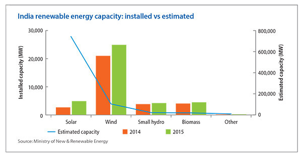 However, installed capacity lags behind this estimate: about 39 GW of grid-connected renewable energy was in place as of March 2015, with wind accounting for 25 GW. To boost these numbers, the government has targeted 175 GW of installed renewable capacity by 2022, and implemented a number of incentives to encourage development, including a 10-year tax holiday for solar power projects and obligatory purchases of renewable energy by states.