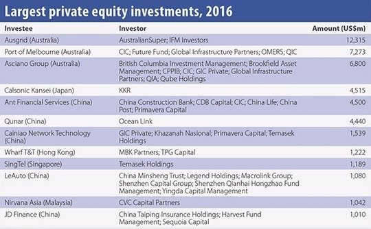 Of the $111.7 billion in private equity capital committed in Asia over the course of 2016, approximately one third went into seven deals: three Australian infrastructure privatizations and four late-stage China technology investments.