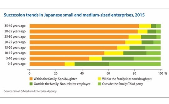SMEs account for 99.7% of the enterprises in Japan and 70% of employment, according to the Ministry of Economy, Trade & Industry (METI). Over the last 20 years, the average age of the SME founder has increased from 47 to 66. Moreover, 20 years ago, three quarters of companies would stay within the family as control was passed from the founding generation to the next. Now only about one third follow this path; close to 40% go to third parties with no ties to the family.