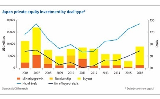 Advantage's seven deals represent the busiest year in the firm's history. The story is much the same for the industry as a whole. According to AVCJ Research, private equity investment in Japan (excluding VC capital) came to $9 billion, three times the 2015 figure and the largest annual total since 2007.