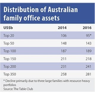 There were about 310 family offices and high net worth individuals (HNWIs) in Australia with assets of A$100 million or more as of June 2016, according to The Table Club. The 200 largest family offices have A$241 billion between them and over half of that resides with the top 50.