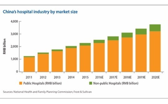 In the face of these challenges, the government decided to allow first private investors and then foreign investors to enter the sector. By 2015, of the 27,587 hospitals in China, approximately 50% were privately run. However, the public sector still accounts for the bulk of revenue, generating RMB2.09 trillion in 2015 to the private sector's RMB203.6 billion.