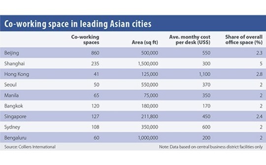 Colliers International pegged the number of co-working spaces in 12 leading cities across Asia Pacific at nearly 1,700 at the end of last year, with total floor space of 4.8 million sq ft. The build-out has been particularly visible in China, with Beijing and Shanghai hosting more than 1,000 spaces between them. Hong Kong represents the top end of the market: 41 centers and an average monthly cost per desk of $1,100. This compares to 127 centers and $450 per desk in Singapore.