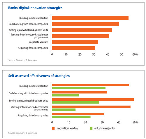 But the survey also revealed that confidence in these approaches was not strong. Among institutions considered by Simmons & Simmons to be innovation leaders – those describing their digital innovation as ahead of rivals – none of the strategies identified had a majority describing them as effective. Setting up an internal fintech business unit had a 49% following, while setting up fintech accelerators followed at 47%.