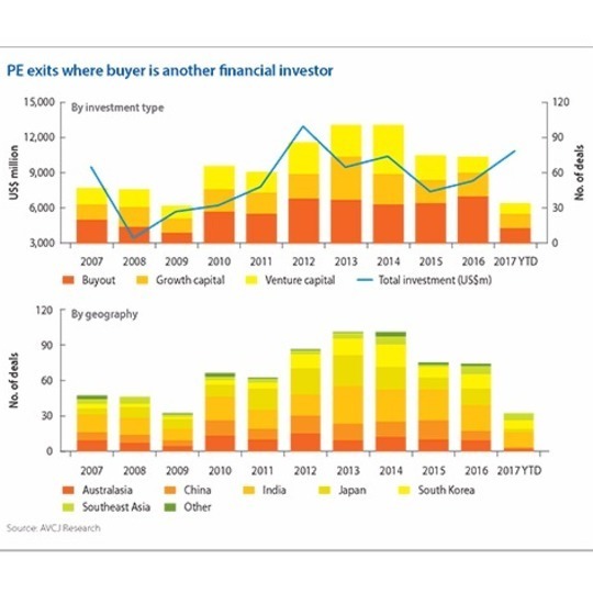 Within these numbers, though, two trends are worth noting. The buyout share of secondary exits has gradually increased over the past six years, reaching 40 in 2016. And there is greater geographical variety. The bulk of deals have traditionally come from Australia and India, Asia's most developed buyout market and its preeminent PIPEs location (making it particularly suited to secondary exits), respectively. Now, the likes of China, Japan and Korea are becoming more active.