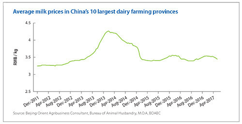 Modern Dairy noted in its most recent annual report that last year the total quantity of imported liquid milk and imported bulk milk powder in China reached 630,000 tons and 600,000 tons, respectively, an increase of 38% and 11%. According to domestic agribusiness consultancy BOABC, the average milk price in China's 10 largest dairy farming provinces slipped below RMB3.40 per kilogram in the middle of 2016. It surpassed RMB4.20 per kg in 2014.