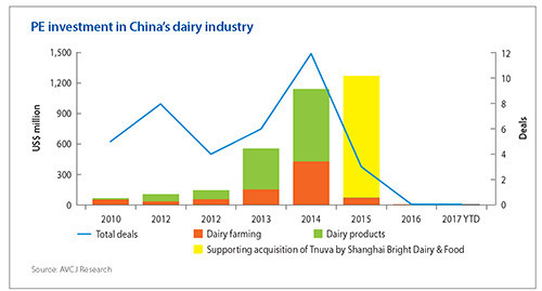 PE investors pumped nearly $900 million into Chinese dairy farming assets in 2013-2015, while the broader dairy products space received $1.1 billion, according to AVCJ Research. KKR and CDH Investments had already found success with China Modern Dairy and these new deals were underpinned by a similar thesis: consumers are willing to pay a premium for high-quality, safe products; and integrated dairy operations are the best way to create transparent supply chains.