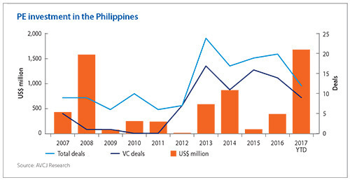 Private equity investment in the Philippines stands at $1.69 billion so far in 2017, more than any full-year total on record. Almost all this capital can be traced back to two deals: GIC Private and Macquarie Infrastructure & Real Assets' $1.28 billion investment in renewable power producer Energy Development Corp. and Partners Group's acquisition of business process outsourcing (BPO) company SPi Global for $330 million, which provided an exit for CVC Capital Partners.
