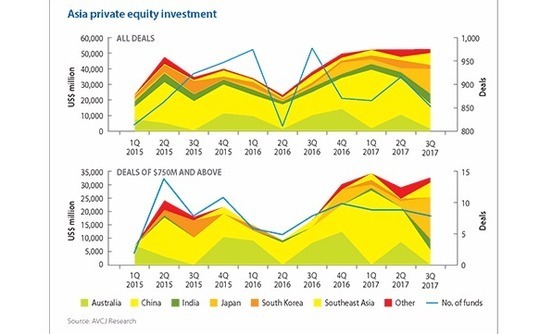 Nine months into 2017 and investors have already deployed more than they did across the full 12 months of 2015 and 2016. The industry seems healthy, almost dangerously so, but the impact of unusually large deals cannot be overstated. In September it was the widely anticipated acquisition of Toshiba Memory Corporation (TMC) by a Bain Capital-led consortium. The deal was worth JPY2 trillion ($17.8 billion), although AVCJ Research deducts the capital that Toshiba is reinvesting in the asset and puts the total at $14.7 billion.