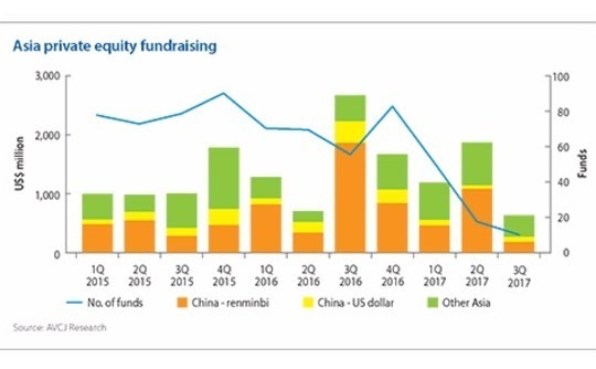 Twelve months ago, the arrival of large state-sponsored Chinese funds took private equity fundraising to new highs. At least one of these vehicles has made an appearance in every quarter since then – until July-September 2017. A total of $12.6 billion went towards partial or final closes of Asia-focused PE funds, the least in nearly four years, although previously undisclosed activity may yet enter the public domain.