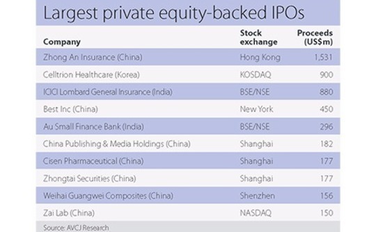 The largest offering of the quarter was Zhong An Insurance, which raised $1.5 billion in Hong Kong, but two of the top five were Indian companies. Au Small Finance Bank’s IPO is one of India’s most successful, coming in heavily oversubscribed and enabling the company to raise INR19.1 billion ($296 million). Warburg Pincus, the International Finance Corporation, ChrysCapital and Kedaara Capital all made partial exits. It is trading at a 68% premium to the IPO price.
