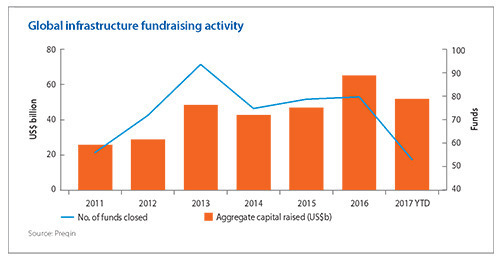 According to Preqin, the aggregate value of infrastructure deal flow has escalated steadily since the 2011 sovereign debt crisis to $513 billion last year. Meanwhile, unlisted infrastructure fundraising has seen similar momentum, reaching a total of $65.6 billion in 2016 compared to $47 billion in 2015 and about $26 billion in 2011.