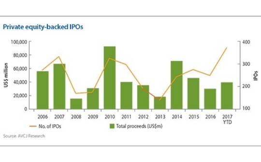 Meanwhile, China's domestic bourses have enjoyed their busiest year on record for private equity portfolio companies: 246 listings across the Shanghai and Shenzhen A-share markets and Chinext. This is not far off the combined total for 2014-2016.