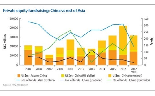 It continues a trend established last year by Chinese governments – central and provincial – effectively distorting headline fundraising numbers by launching successive private sector vehicles to bankroll their policy objectives. In 2016, a record $127.2 billion was committed to PE funds in Asia, with renminbi-denominated vehicles accounting for $0.60 of every $1 raised. Three large state-backed funds accounted for about one-third of the overall pool on their own.