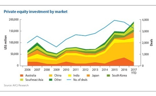 Three years ago, private equity investment in Asia topped $100 billion for only the second time, finally inching past the previous record high set in 2007. That total could be doubled in 2017, with $191.7 billion deployed as of early December, according to provisional data from AVCJ Research. Buyout deal flow alone is nearing three times the 2014 figure.