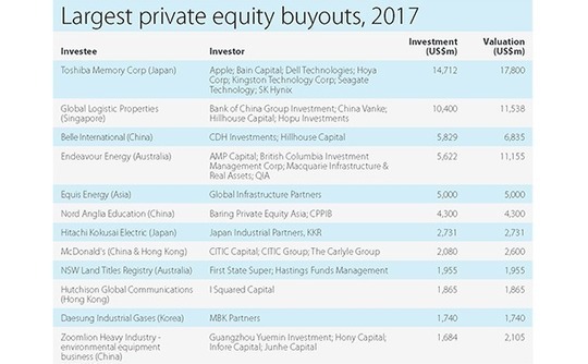 No other US dollar-denominated final close in 2017 is anywhere near the KKR vehicle, but others are in the pipeline. Having reached a first close of $4.5 billion on its latest Asia buyout fund in October, Carlyle has set a hard cap of $6.5 billion, which if hit would result in a corpus 66% larger than its predecessor. Meanwhile, Affinity Equity Partners is said to be on course to close on least $5 billion by year end. The debate about whether the amount of capital available at the top end of the market is in danger of exceeding the investment opportunity will surely continue.