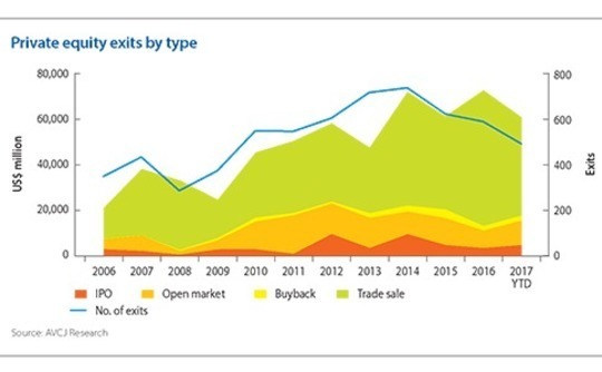 Nevertheless, with $61.1 billion generated across all exits so far in 2017, last year's record high of $73.1 billion is unlikely to be surpassed. The 28% year-on-year fall in trade sale activity to $43.5 billion has been influential, with Asia seeing relatively few of the bumper deals that traditionally move the needle. Trade sales of $1 billion or more number eight, half the 2016 total.
