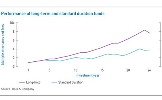 A recent study by Bain & Company would seem to justify investors' enthusiasm. In its most recent global private equity report, the firm modeled the performance of a long-term PE fund exiting a company after 24 years, versus a typical PE investor purchasing and exiting four companies through multiple funds over the same period. It found that the long-hold fund reached almost twice the total returns of the short-duration vehicles over the same period.