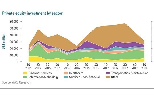 The significance of internet-enabled technology to regional PE deal flow is well-established. Even as investment activity reached a record high last year on the back of traditional buyouts, venture and growth deals for start-ups still accounted for over 20% of capital committed. This rose to 32% in the final three months of 2017 and 35% in the first quarter of 2018.