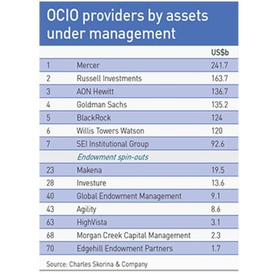 Charles Skorina, a US-based headhunter who specializes in placing CIOs and senior investment officers, argues that it is difficult for an endowment OCIO to get traction in the current climate. "Virtually all endowments and foundations with over $1 billion in AUM have internal managers and most that would outsource have already done so," he says. Meanwhile, US corporate pensions have little appetite for alternatives and tend to outsource to mainstream asset managers.