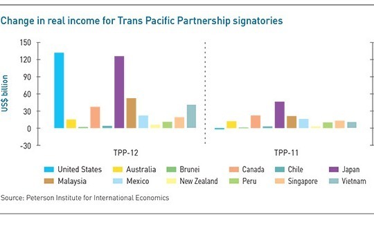 Ironically, the only loser in the TPP-11 would be the US itself, which would go from a $131 billion gain over the baseline in the original deal to a $2 billion drop as an outsider. Such predictions have led to hopes that the US will rejoin the agreement. The suspension rather than outright removal of provisions is intended to make this easier, since once the US rejoins the deal can quickly be restored to its former state.