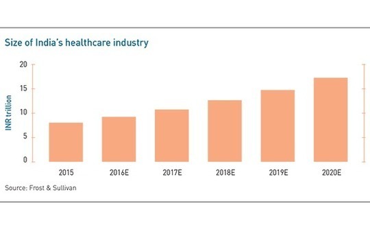 India's hospitals are at the center of a growing supply and demand gap. The country's healthcare sector was worth INR8 trillion ($116 billion) in 2015 and Frost & Sullivan expects it to more than double in value by 2020. By far the majority of this value is in healthcare delivery – i.e. hospitals – which accounted for 68% of overall sector revenue in 2016, with pharmaceuticals, the next-largest segment, on just 13%, and devices at 9%.