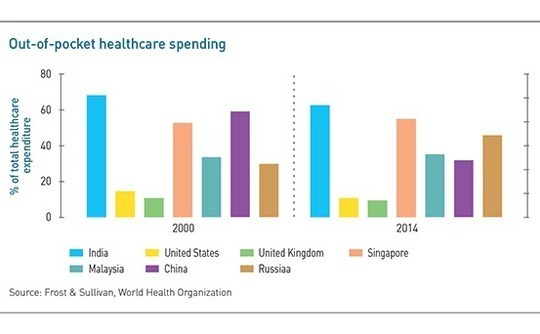 Private sector hospital operators have historically been crucial to this system. Spending by India's government on healthcare has consistently been lower than in other countries, representing 1.4% of GDP in 2014 compared to 8.3% in the United States, 3.1% in China and 2.1% in Singapore. As a result, 62.4% of overall Indian healthcare expenditure in 2014 was met out of pocket, the highest of all countries studied by Frost & Sullivan.