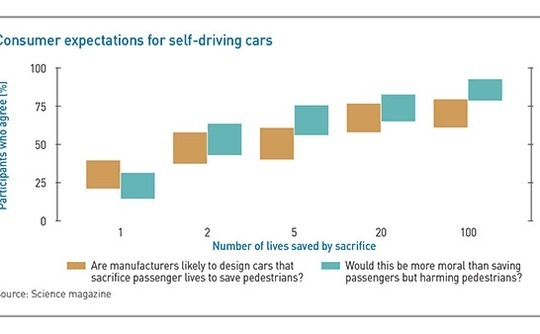 A survey of US consumers in 2016 provides some insight into the customer mindset. When asked whether autonomous vehicles should be programmed to sacrifice the lives of their occupants if it would mean avoiding a collision with innocent pedestrians, most agreed that this would be the moral thing to do as long as the number of pedestrians saved outnumbered those in the vehicle.