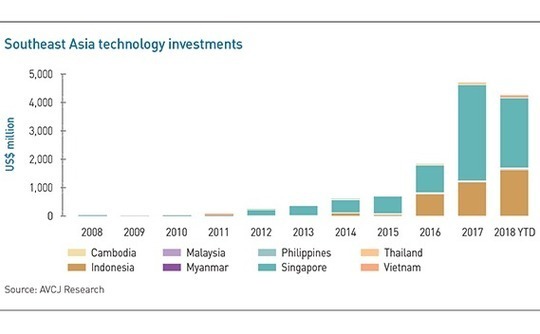 Investment activity among Southeast Asia's technology start-ups has grown rapidly in recent years: AVCJ Research shows that total commitments increased from less than $1 billion in 2015 to nearly $2 billion the following year, and then to $4.7 billion last year. That record is unlikely to stand for long, with $4.2 billion in investments recorded in 2018 to date. Singapore and Indonesia have seen by far the biggest share of this growth, though investments in Malaysia and Thailand have risen steadily as well.
