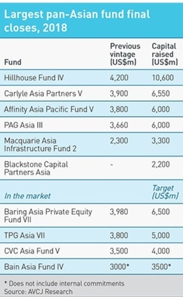 Affinity Equity Partners took just four months to reach a first and final close on its fifth pan-regional vehicle of $6 billion, a 57% increase in size on Fund IV. The re-up rate was 95%, which meant there was little space for new investors, even if they could work within the condensed timeframe. PAG Asia Capital also raised $6 billion in a single close. The firm's previous fund was $3.66 billion.