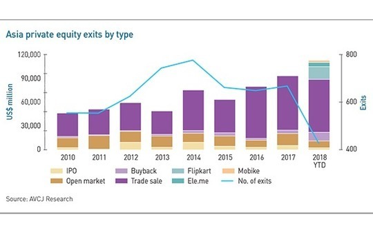 Asia private equity exits have surpassed $100 billion for the very first time – thank Flipkart, Ele.me, Mobike, and a reverse merger by Beijing Automotive Industry's electric vehicle unit. These four transactions account for nearly one-third of the record $90 billion in trade sale proceeds so far this year. With public share sales suffering due to market volatility, M&A is the key contributor to the $111.9 billion in overall exit value. This comes from fewer than 450 transactions, compared to more than 650 in 2017, which only serves to emphasize the influence of big-ticket deals.
