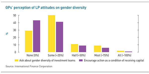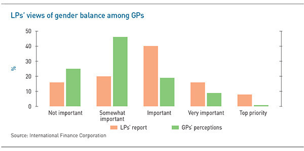 LPs might be surprised to hear that they aren't pushing for representation at venture firms, because in their view they have been: 64% of LPs reported last year that they viewed gender balance as important, very important, or a top priority, according to IFC. But the perception among GPs is significantly different: more than 70% of firms reported that their LPs viewed gender balance as either not important or somewhat important and the vast majority said that less than a quarter of their LPs had encouraged them to improve their gender representation.