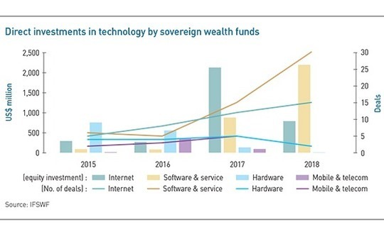 The biggest contributing factor, however, may be that several development areas related to online and enterprise technologies have become de-risked. SWF direct investment in internet and software has spiked dramatically since 2016, according to the International Forum of Sovereign Wealth Funds (IFSWF), while hardware and mobile categories have floundered. Software has seen the most impressive uptake, with SWFs' direct investments globally jumping from $91 million in 2016 to $882 million in 2017 and $2.2 billion last year.