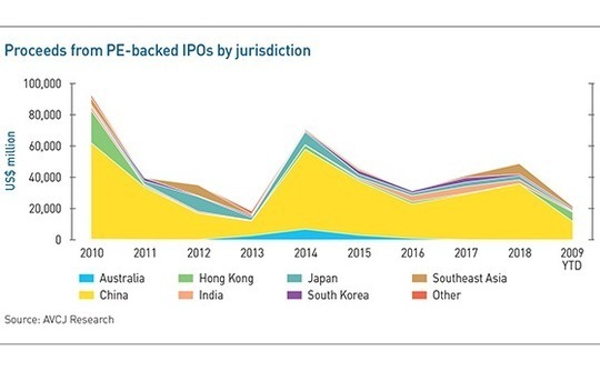 Hong Kong remains something of an outlier, though 2019 has hardly been easy. The exchange played host to six of the 10 largest private equity-backed IPOs in the region and 20 overall, with proceeds reaching $10.4 billion. In 2018, 23 companies raised $15.4 billion. Even so, there is still a trend of large offerings failing to gain traction in Hong Kong. Notably, Budweiser Brewing – which qualifies as a private equity portfolio company only because of GIC Private's pre-IPO investment – raised $5.8 billion, but the total is about half what the company sought to raise before aborting the process three months earlier.