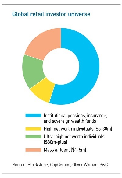 Still, even the heavyweights have found the mountain of retail money impossible to ignore. Citing data from CapGemini, PwC, Oliver Wyman, and Cerulli Associates, Blackstone has tallied the global retail market at $68 trillion, versus an $84 trillion market for pensions, insurance companies and sovereigns. About $30 trillion of the retail space is in the mass affluent category. These are people with personal wealth in the range of $1-5 million, below the threshold that typically defines high net worth individuals.