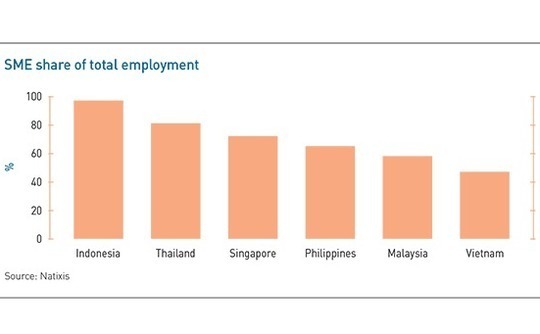 The problem is that most of the government relief in Southeast Asia to date has come in the form of social safety nets for low-income individuals or bailouts for state-owned enterprises. Natixis notes, however, that SMEs are often a disproportionately large slice of the economy in Southeast Asian countries. They account for 97% of jobs in Indonesia and 81% in Thailand.