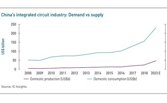 More than 60% of the world's semiconductors end up in China, many of them installed in handsets produced by smart phone manufacturers. It is home to nine of the world's top 12. Last year, imports of these hearts – electronic circuits that comprise one part of a semiconductor, otherwise known as chips or integrated circuits (IC) – amounted to $305 billion. This represented 15% of the country's overall import value. China's IC trade deficit was $203 billion, according to customs statistics.