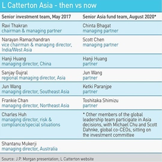 A more substantive development came in early 2019 when Thakran revealed plans to spin-out and raise a growth fund, with L Catterton's blessing. About a dozen senior members of the Asia team were involved, from the investment and operations sides of the business. They included, in addition to Thakran, Narayan Ramachandran, Shantanu Mukerji, and Jun Wang. All three were among the six identified in the key person clause. The group also agreed to do a management buyout of Funds I and II.