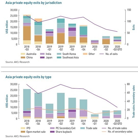 The switch from strategic to private equity buyer isn't surprising. While AVCJ Research's records thus far show little indication of an upturn in trade sales as 2020 has progressed, sales to financial sponsors rose from $436 million in the first quarter to $1.9 billion in the second and $2.9 billion in the third to mid-September. The number of transactions has increased as well.