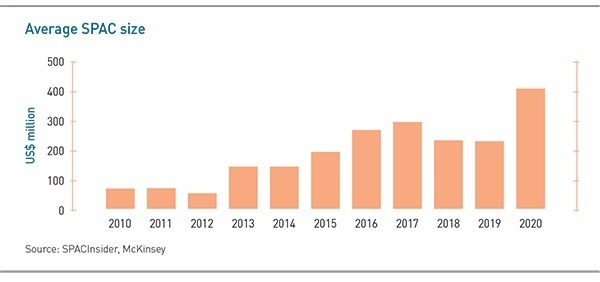 LPs, especially hedge funds, are attracted to the risk-reward profile. Their investments are essentially guaranteed by the SPAC until it acquires an asset, at which point they can redeem their principal plus interest and some upside on the relevant warrants or hold on in expectation of a larger pay day. There is also the option of voting down a deal. According to McKinsey & Company, the average SPAC has increased more than fivefold in size over the past decade, jumping from roughly $230 million in 2019 to more than $400 million in 2020.