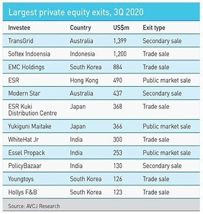 Three months ago, private equity exits in Asia were still in a trough and there were no megadeals to offer respite. In the third quarter, two were announced: Kuwait Investment Authority sold a 20% stake in Australian electricity grid operator TransGrid to Ontario Municipal Employees Retirement System (OMERS) for $1.4 billion and Softex Indonesia was acquired by Kimberly-Clark for $1.2 billion, facilitating an exit for minority investor CVC Capital Partners.