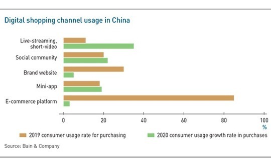 On the store side, the heightened urgency to blend offline and online business models this year has resulted in an already complex mix of data-driven omnichannel and smart phone-driven strategies starting to take a significantly bigger slice of the retail pie. Bain finds that only 11% of Chinese consumers made purchases using livestreaming and short-video channels in 2019, but that figure is set to grow by 35% in 2020.