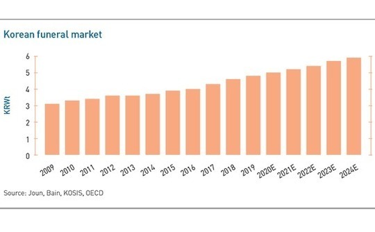 Korea's currently KRW4.8 trillion funeral market is projected to grow stably at 4.3% a year on the back of rising death rates and decreasing family sizes, which translates into less capacity to coordinate traditional ceremonies.