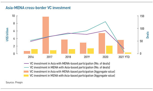 A slightly different narrative emerges at the venture end of the private equity spectrum. While VC investment from Asia into MENA start-ups remains similarly anemic, capital flows in the opposite direction appear to have enough scale to begin snowballing with the right impetus. The annual value of Asia VC deals with MENA participation in the past four years has ranged from $2.9 billion to $9.7 billion.