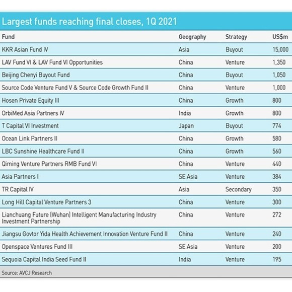 Nine of the 15 largest were by funds primarily pursuing China venture or growth strategies, a COVID-19 resistant agenda if ever there were one. KKR was followed in the quarterly rankings by Lilly Asia Ventures and Source Code Capital, which raised $1.35 billion and $1 billion for their latest sets of funds. Firstred Capital, a China GP that secured $1 billion for a debut renminbi fund with a mandate to facilitate corporate M&A, completes the top four.