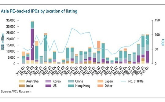 The IPO postscript is the relative weakness of listings within mainland China. Ever since the introduction of Shanghai's Science & Technology Innovation Board – better known as the Star Market – last year, mainland exchanges have been the most active for PE-backed companies in Asia. But between January and March, the number of offerings fell below 40 for the first time in a year, while proceeds slipped to $5.1 billion, the third straight quarterly decline.