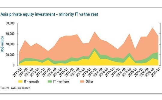 Growth-stage rounds for internet-related companies were the rocket fuel that propelled Asian private equity investment to a record quarterly high in the last three months of 2020, ensuring a robust yearly total despite COVID-19. Three months into 2021, the headline number isn't as large, but the broad theme remains pertinent. Indeed, the IT concentration effect was more pronounced in the first quarter than it was in the fourth.