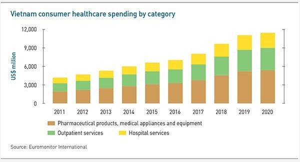 According to the World Bank, domestic private healthcare expenditure per capita increased by 50% between 2011 and 2018, reaching $80. Over the same period, Euromonitor International found that consumer healthcare spending rose 130% to $9.6 billion. As of 2020, it was $11.4 billion, with a near equal split between pharmaceuticals and medical equipment and hospital and outpatient services.