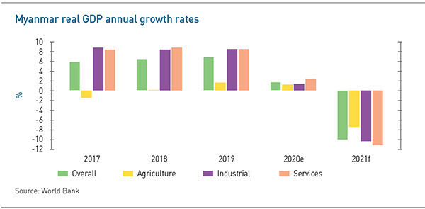 Now the situation is so uncertain that forward plans are virtually impossible to make, and economic outlooks have never been bleaker. The World Bank estimates that the economy slowed from a growth rate of 6.8% in 2019 to 1.7% last year due largely to the impacts of the pandemic. The development finance institution (DFI) expects the economy to contract 10% in 2021, and it's worth noting that this period will include four pre-coup months.