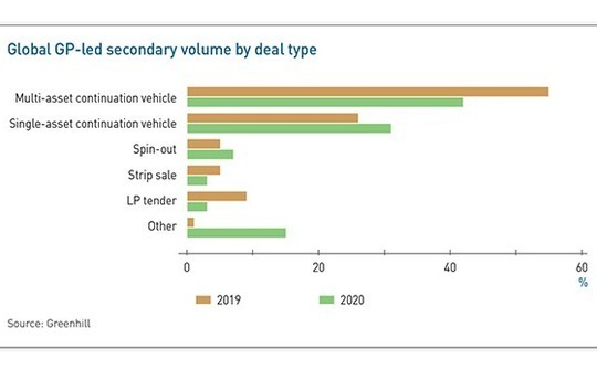 As recently as four years ago, sales of LP fund positions dominated secondary activity, with GP-led transactions accounting for less than one-quarter of global volume. In 2020, the GP-led share hit 44%, as the market rebounded aggressively from a COVID-19 induced lull with a slew of continuation funds, spinouts, strip sales, and LP tender offers in the second half of the year, according to Greenhill.